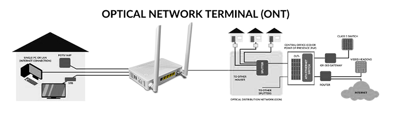 • Data transmission: The ONT is responsible for transmitting data from the fiber optic network to the user equipment, and from the user equipment to the fiber optic network. This includes internet data, phone communications, television signals, and more.